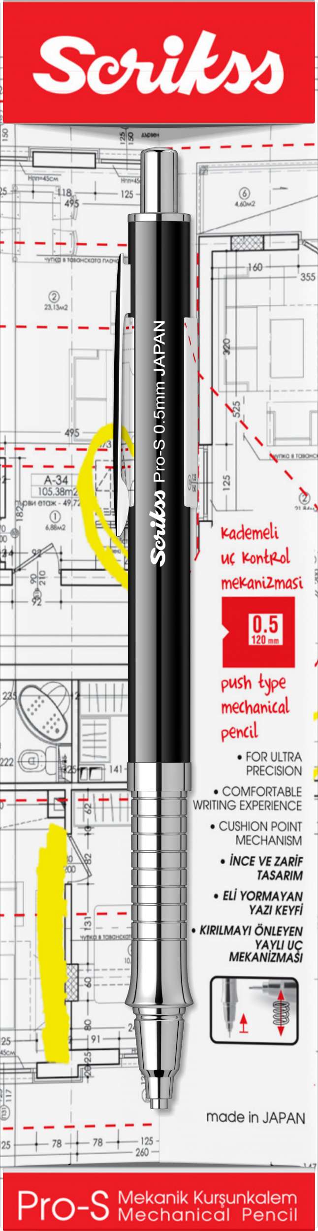* Mekanik kurşun kalemde profesyonellik arayanların tercihi. Japon menşeli mekanik mekanizmaya sahip Pro-S; ergonomik tasarımı, mükemmel ağırlık dengesine sahip metal gövdesi yazma eylemini bir sanata dönüştürüyor ve aradığınız profesyonellği size sunuyor. Geri çekilebilir uç yapısı sayesinde taşıma esnasında metal uç zarar görmüyor. Profesyonel yazım ve çizim performansı arıyorsanız Pro-S tam size göre.