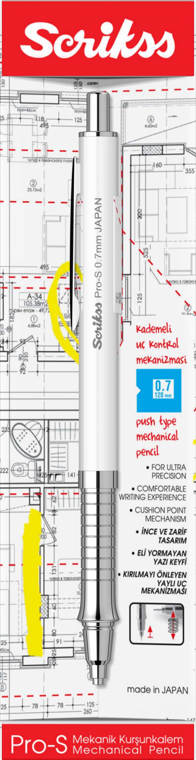 * Mekanik kurşun kalemde profesyonellik arayanların tercihi. Japon menşeli mekanik mekanizmaya sahip Pro-S; ergonomik tasarımı, mükemmel ağırlık dengesine sahip metal gövdesi yazma eylemini bir sanata dönüştürüyor ve aradığınız profesyonellği size sunuyor. Geri çekilebilir uç yapısı sayesinde taşıma esnasında metal uç zarar görmüyor. Profesyonel yazım ve çizim performansı arıyorsanız Pro-S tam size göre.