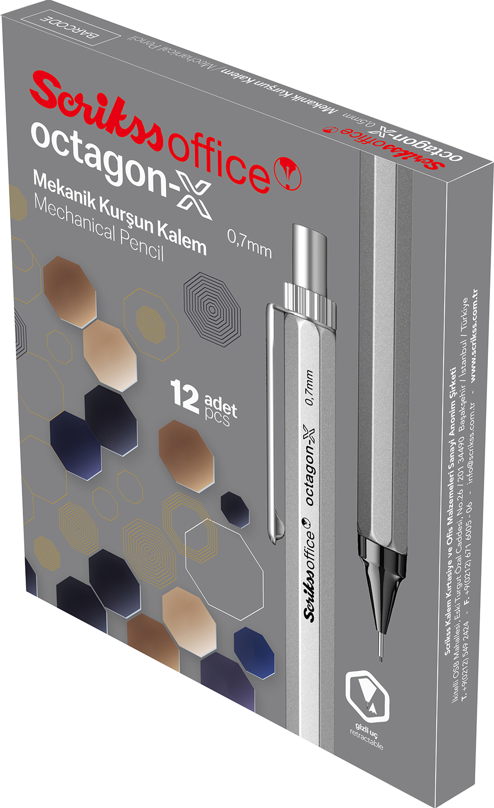 *Güçlü tasarımlarıyla dikkat çeken Octagon-X, mat renklerdeki metal gövdesi ile şık bir görüntü, özel mekanizması ile de kullanım kolaylığı sunuyor. Scrikss Octagon-X’in kademeli mekanizması; tepesine basıldığında ucun yere düşmesini önlüyor, geri çekilebilir metal uç ise kalem ucunun zarar görmeden taşınmasına imkan sağlıyor. Yıllardır kaliteli ve özgün tasarımlarıyla dikkat çeken Scrikss Office’in yeni modeli Octagon-X, kullanıcıların yeni gözdesi olacak